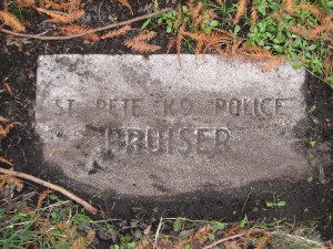 On the farthest corner of the cemetery, in the shade of a tree, we saw a statue of what looked like a German Shepherd dog. As we approached and then scraped the dirt from the closest grave marker, we saw the name “Bruiser.” Another line said, “St. Pete Canine Police.”